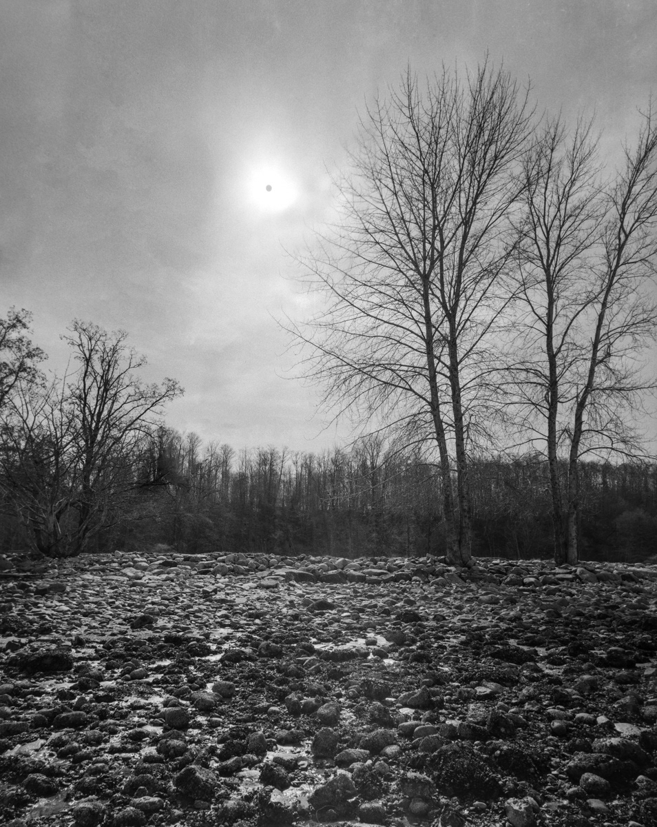 When Ansel Adams wrote about his famous photograph The Black Sun, Owens Valley, California, 1939, he said that he had visualized a reversal of the sun from white to black when he remembered, “high density negative densities actually decrease with very high exposure.” The effect is called solarization and other photographers such as Minor White used it (apparently by accident in his case) and more recently Chris McCaw has been using the sun to burn paper negatives by employing a similar but longer time based method. What fascinated me about this process was that it was definitely something that was unique to film photography and could not be replicated in digital (unless you fake it, which would defeat the purpose).