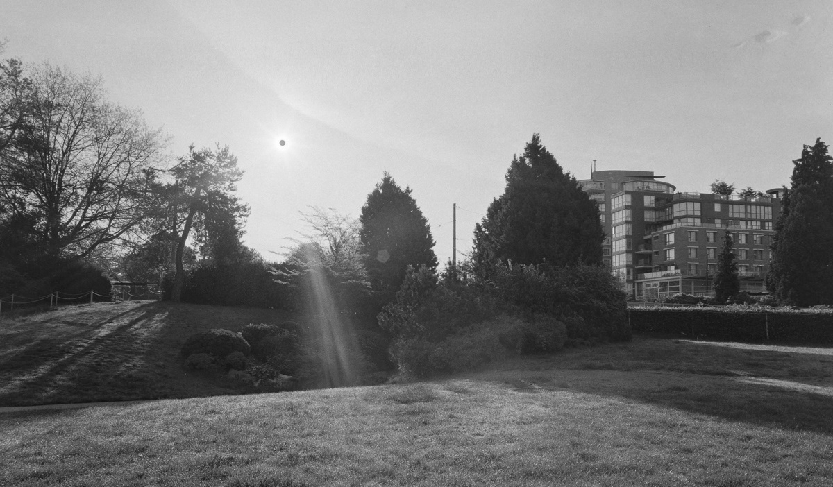 I packed up my Shen Hao 4×5 camera and a Schneider Super Angulon 75mm lens and set off to Spanish Banks to try my luck. It was still March and the sun was relatively low on the horizon, but since the sun doesn’t go down over the mountains in Vancouver I had improvise a semi-interesting shot. I went out onto the tide flats and pointed the camera back towards the shore to get the sun in the photo.
