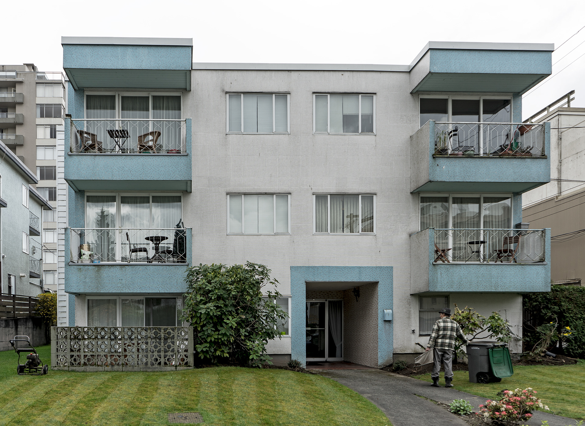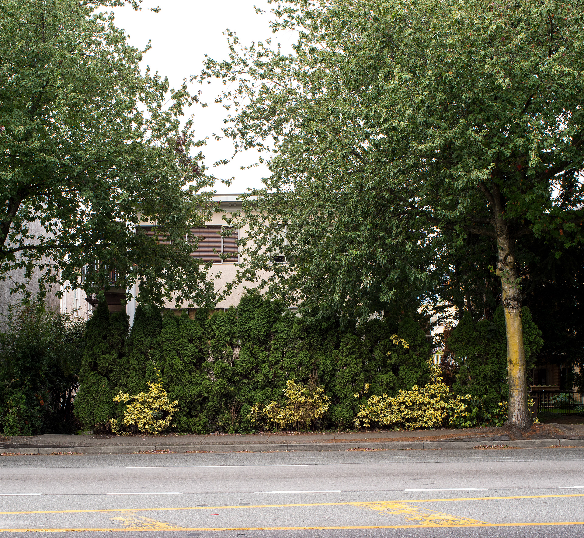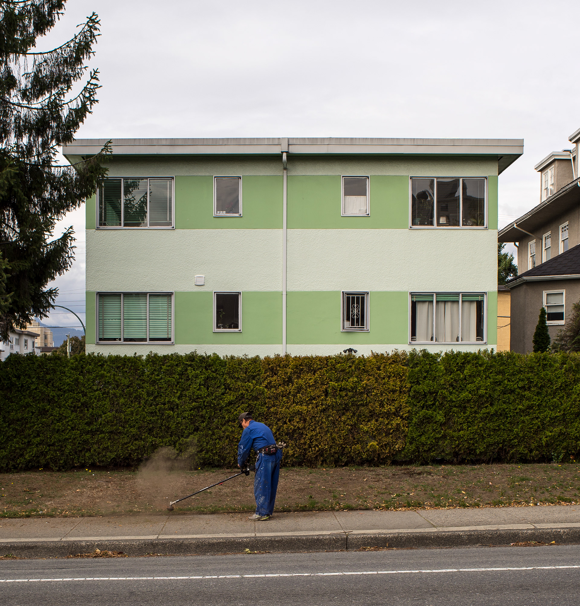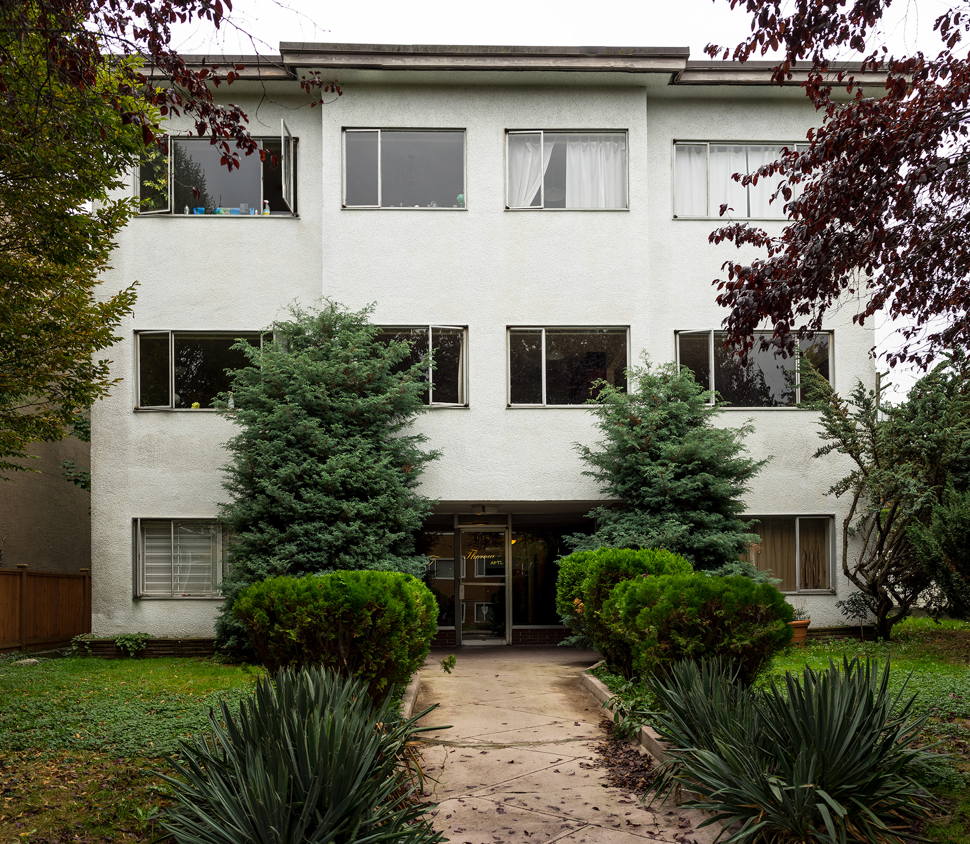 South Granville is a photographic record of a neighborhood being transformed in the current Vancouver housing boom. This project’s effort is to document what is left before it is gone, as well as exploring a vernacular non-spectacular style of photography. It revisits the claim that both Ed Ruscha and John Baldessari had at one time to take pictures “like a real estate agent.” Since real estate and the growing unaffordability of Vancouver is a topic of endless debate, these photographs look at South Granville as one of the last well to do areas in Vancouver that is still sparsely populated with modestly priced low-rise multi-unit apartments. Largely built during the post-war building boom, and while no particular style is prevalent, each has a character type that can only be described as distinctly dated. Most are still lovingly maintained and offer a quirky variety of landscaping with a strong penchant for guard like sentinel bushes. The purposely chosen overcast days of the photographs set up a kind of minor topography in the style of Bernd and Hilla Becher to illuminate as much detail of the apartments and landscaping in a neutral and diffuse light. The proximity to the tony Shaunessy area and Granville St. means that these apartments are slowly being knocked down and replaced with luxury condominiums. The apartments in this survey represent some of the long-term residents that in all likelihood will be the next ones to go, along with the last vestiges of any kind of affordability.