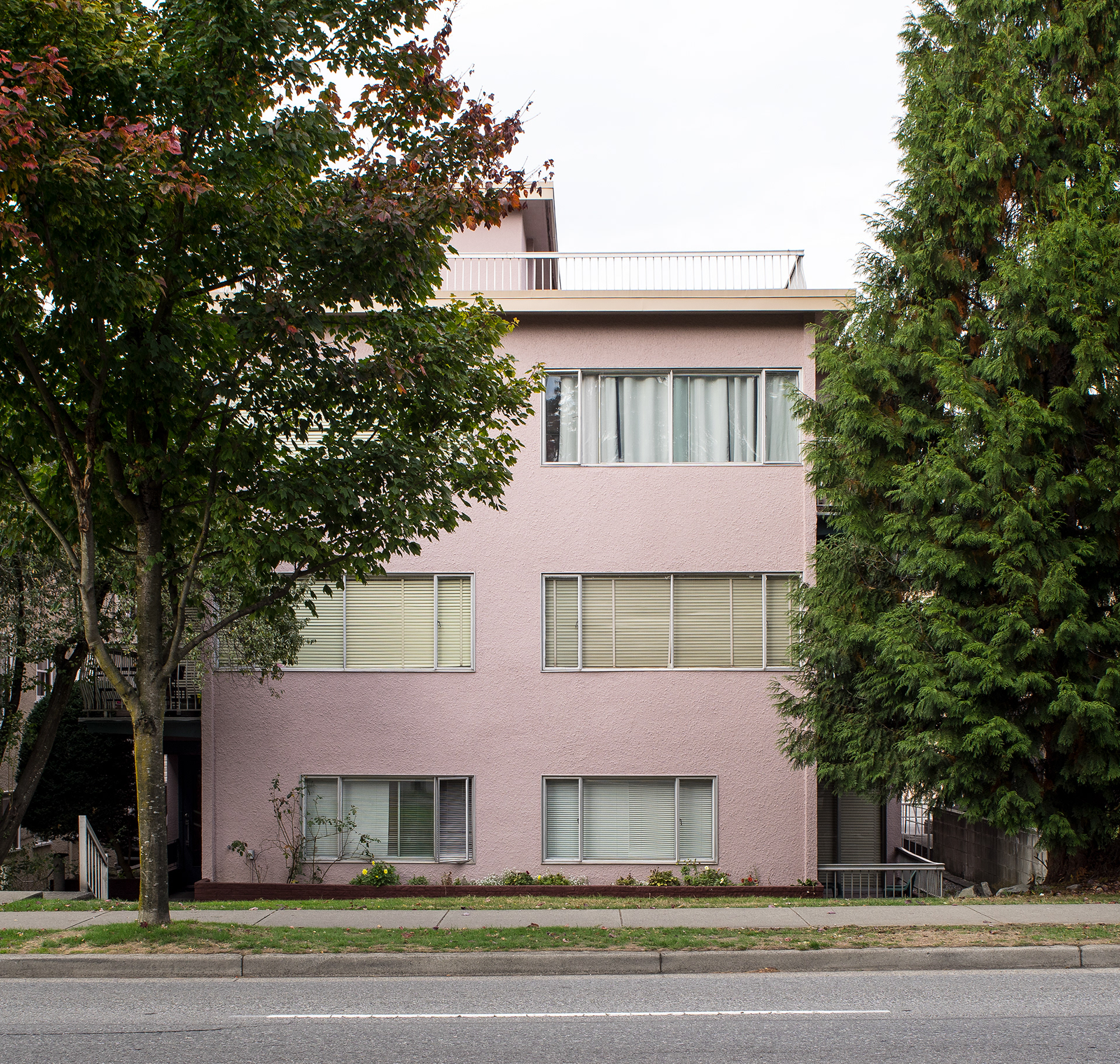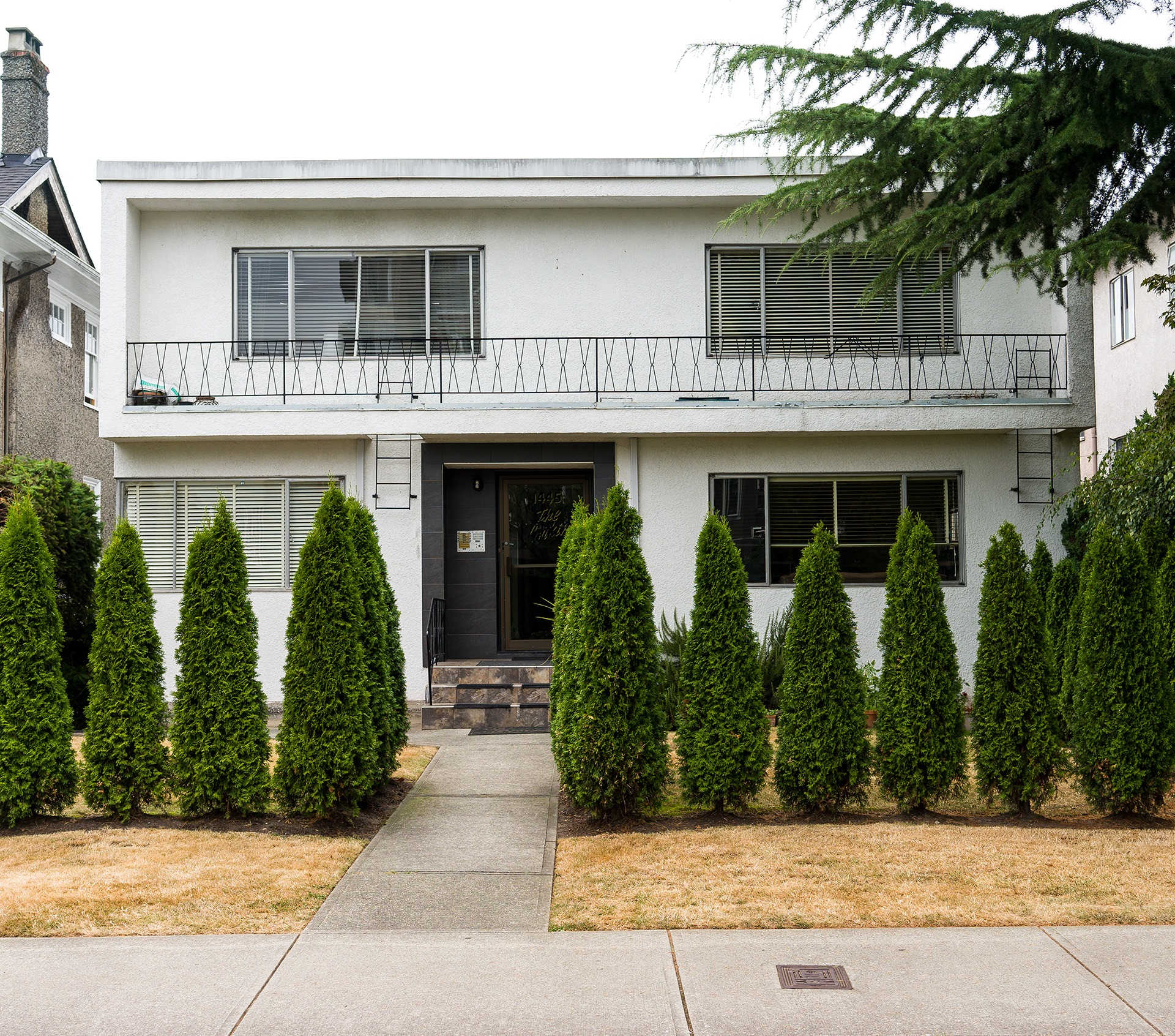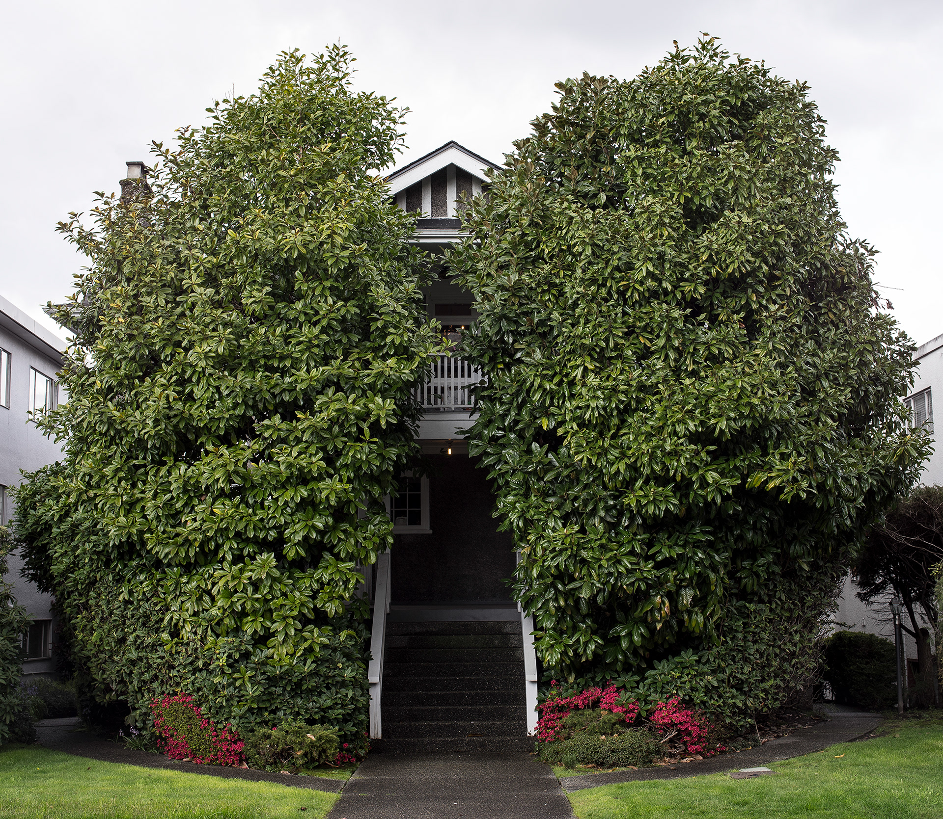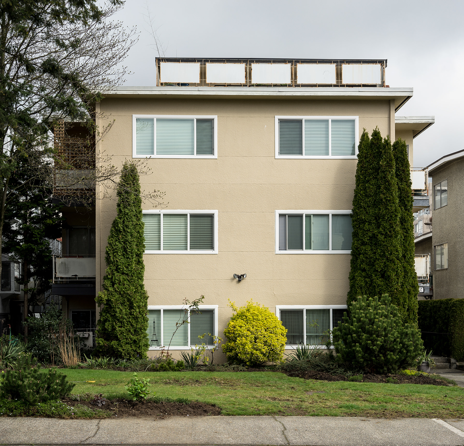 South Granville is a photographic record of a neighborhood being transformed in the current Vancouver housing boom. This project’s effort is to document what is left before it is gone, as well as exploring a vernacular non-spectacular style of photography. It revisits the claim that both Ed Ruscha and John Baldessari had at one time to take pictures “like a real estate agent.” Since real estate and the growing unaffordability of Vancouver is a topic of endless debate, these photographs look at South Granville as one of the last well to do areas in Vancouver that is still sparsely populated with modestly priced low-rise multi-unit apartments. Largely built during the post-war building boom, and while no particular style is prevalent, each has a character type that can only be described as distinctly dated. Most are still lovingly maintained and offer a quirky variety of landscaping with a strong penchant for guard like sentinel bushes. The purposely chosen overcast days of the photographs set up a kind of minor topography in the style of Bernd and Hilla Becher to illuminate as much detail of the apartments and landscaping in a neutral and diffuse light. The proximity to the tony Shaunessy area and Granville St. means that these apartments are slowly being knocked down and replaced with luxury condominiums. The apartments in this survey represent some of the long-term residents that in all likelihood will be the next ones to go, along with the last vestiges of any kind of affordability.