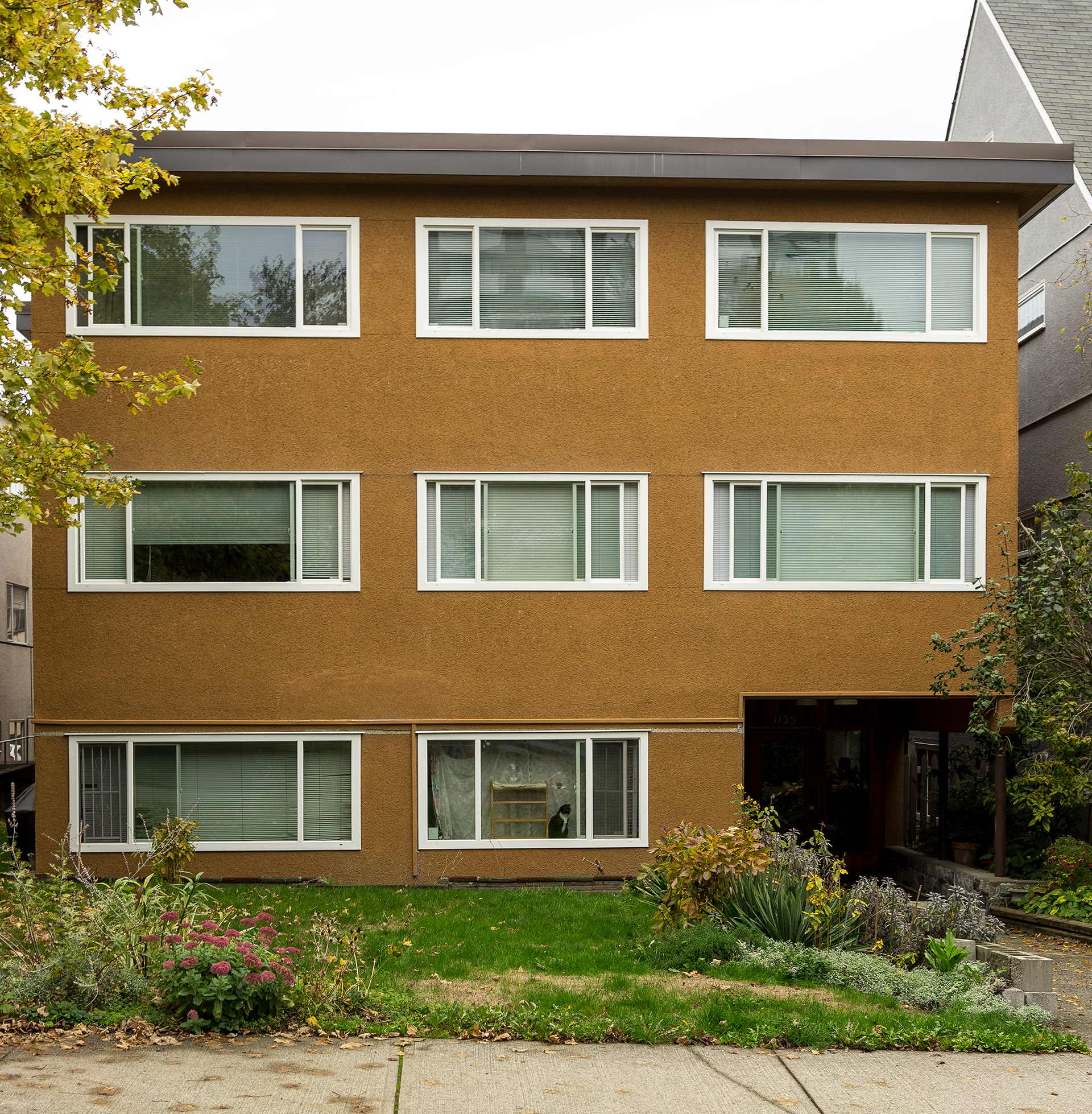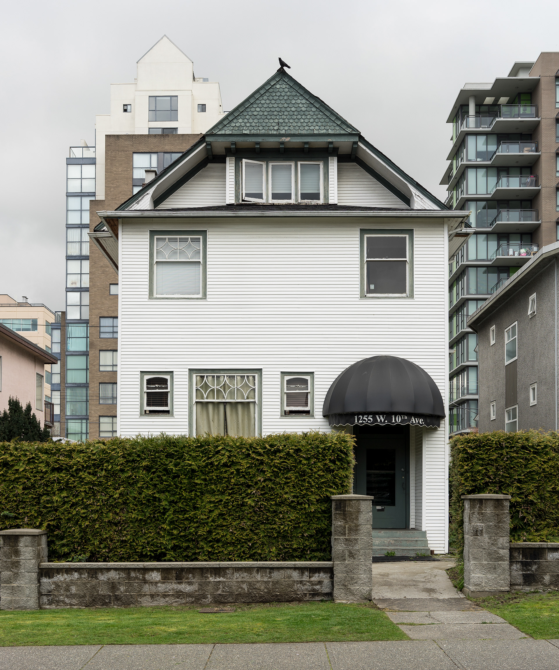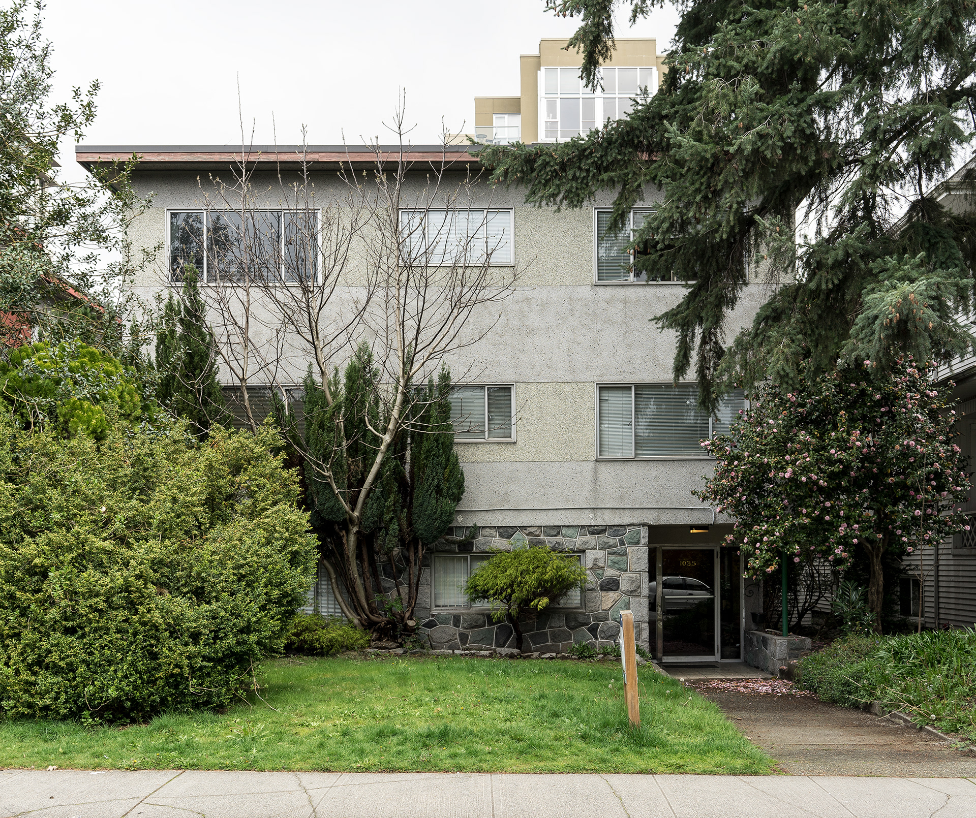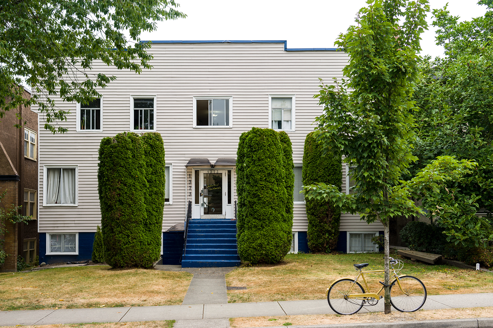 South Granville is a photographic record of a neighborhood being transformed in the current Vancouver housing boom. This project’s effort is to document what is left before it is gone, as well as exploring a vernacular non-spectacular style of photography. It revisits the claim that both Ed Ruscha and John Baldessari had at one time to take pictures “like a real estate agent.” Since real estate and the growing unaffordability of Vancouver is a topic of endless debate, these photographs look at South Granville as one of the last well to do areas in Vancouver that is still sparsely populated with modestly priced low-rise multi-unit apartments. Largely built during the post-war building boom, and while no particular style is prevalent, each has a character type that can only be described as distinctly dated. Most are still lovingly maintained and offer a quirky variety of landscaping with a strong penchant for guard like sentinel bushes. The purposely chosen overcast days of the photographs set up a kind of minor topography in the style of Bernd and Hilla Becher to illuminate as much detail of the apartments and landscaping in a neutral and diffuse light. The proximity to the tony Shaunessy area and Granville St. means that these apartments are slowly being knocked down and replaced with luxury condominiums. The apartments in this survey represent some of the long-term residents that in all likelihood will be the next ones to go, along with the last vestiges of any kind of affordability.